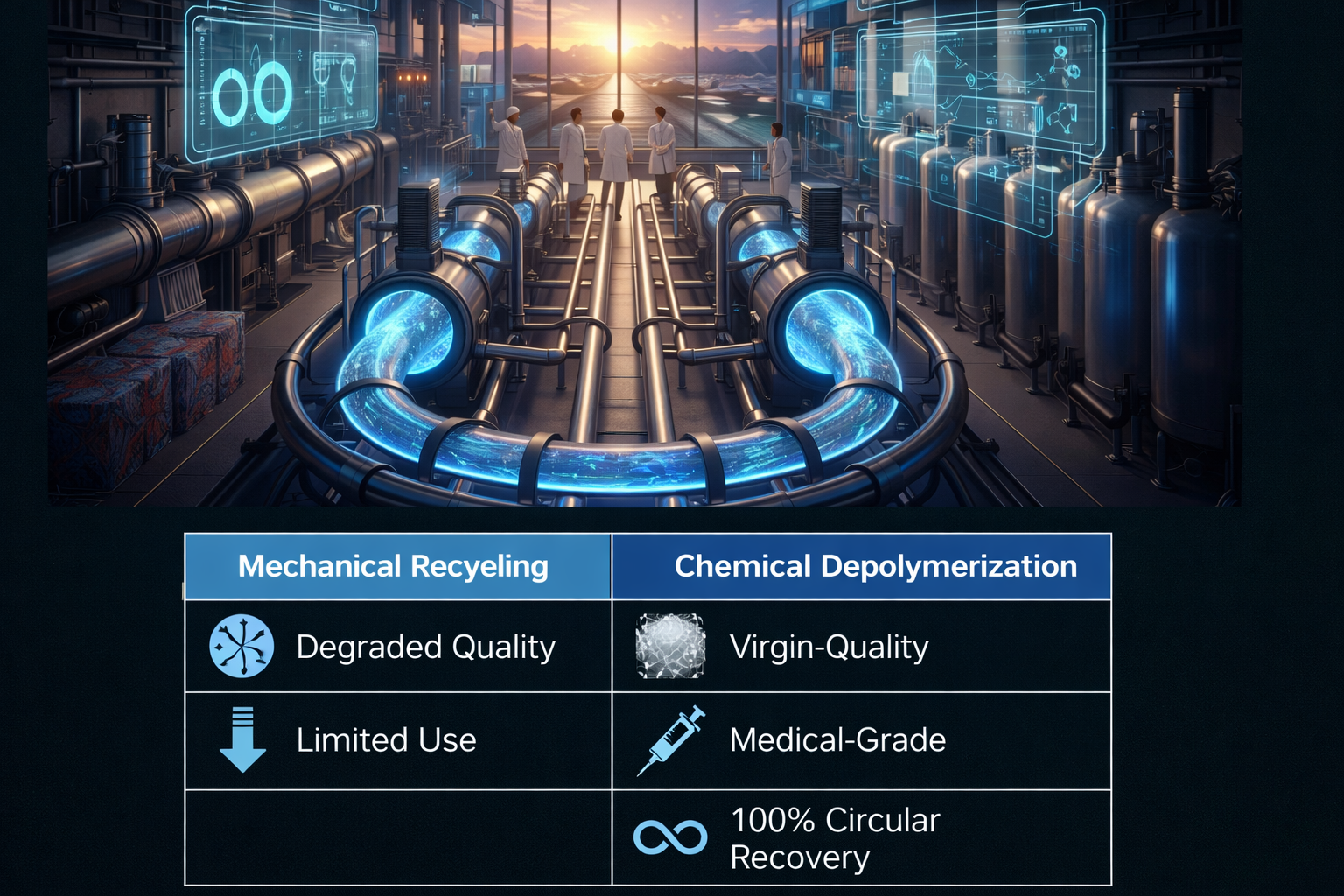 Mechanical recycling often degrades plastic quality, but Advanced Chemical Recycling (Pyrolysis and Depolymerization) breaks waste down to its original monomers. By 2026, the industry is scaling “virgin-quality” recycled feedstocks that meet the stringent requirements of medical-grade and food-contact packaging.